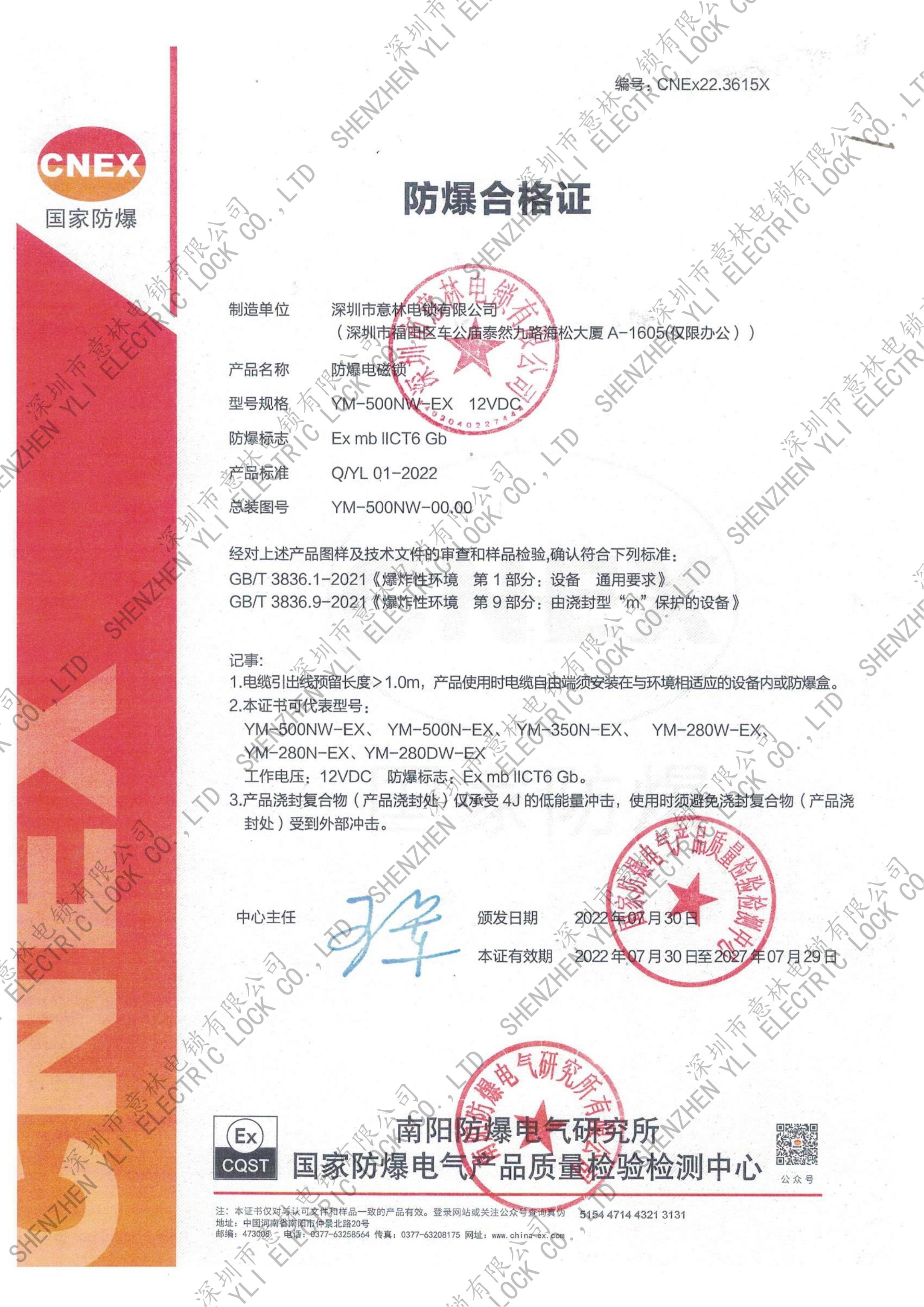 YB-500A_B、YB-500I、 YB-500U型號電插鎖CE認(rèn)證