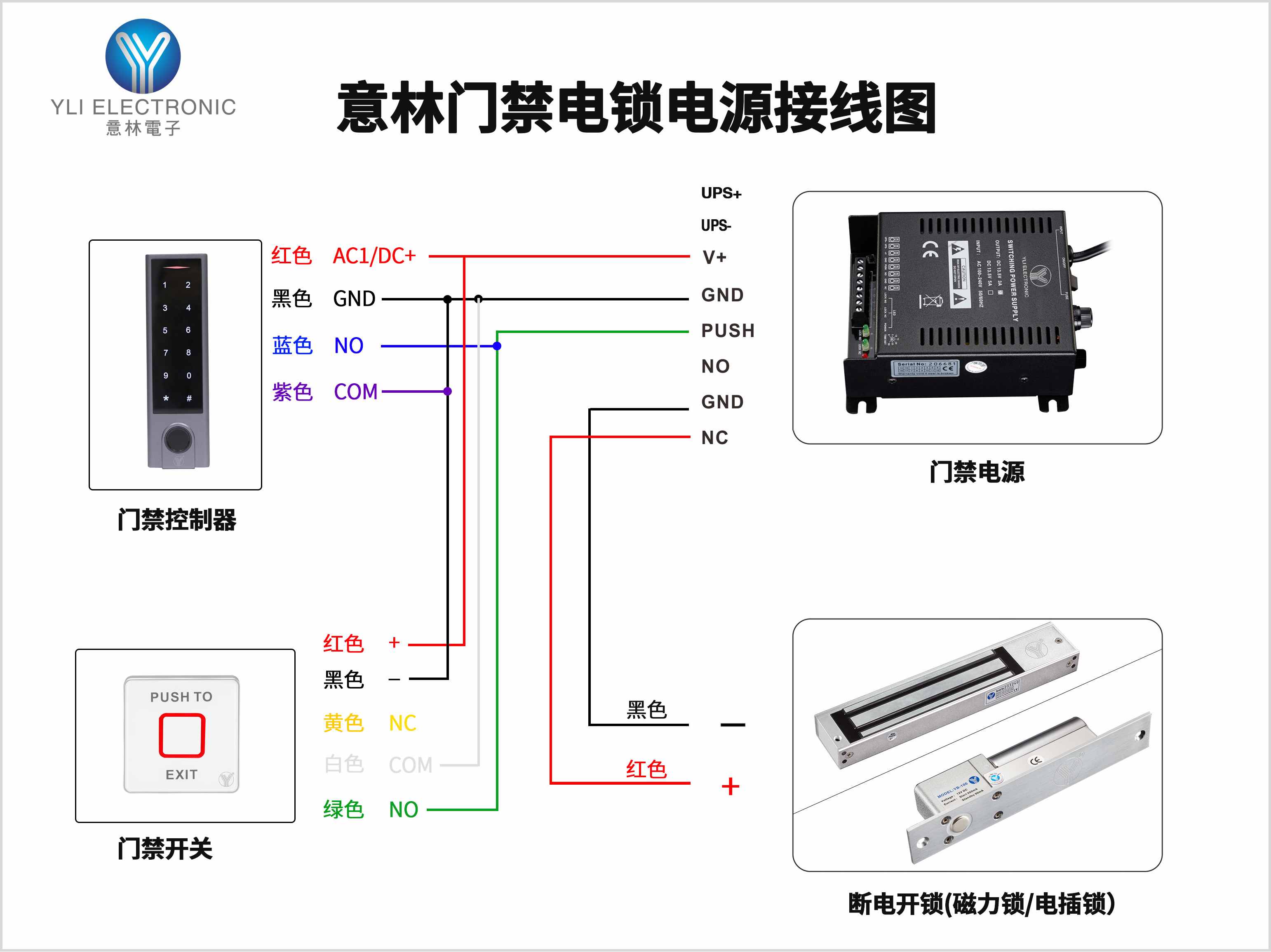 額外有COM、NO、NC三條線,是門磁信號線,用于反映門的開和關(guān)狀態(tài)。