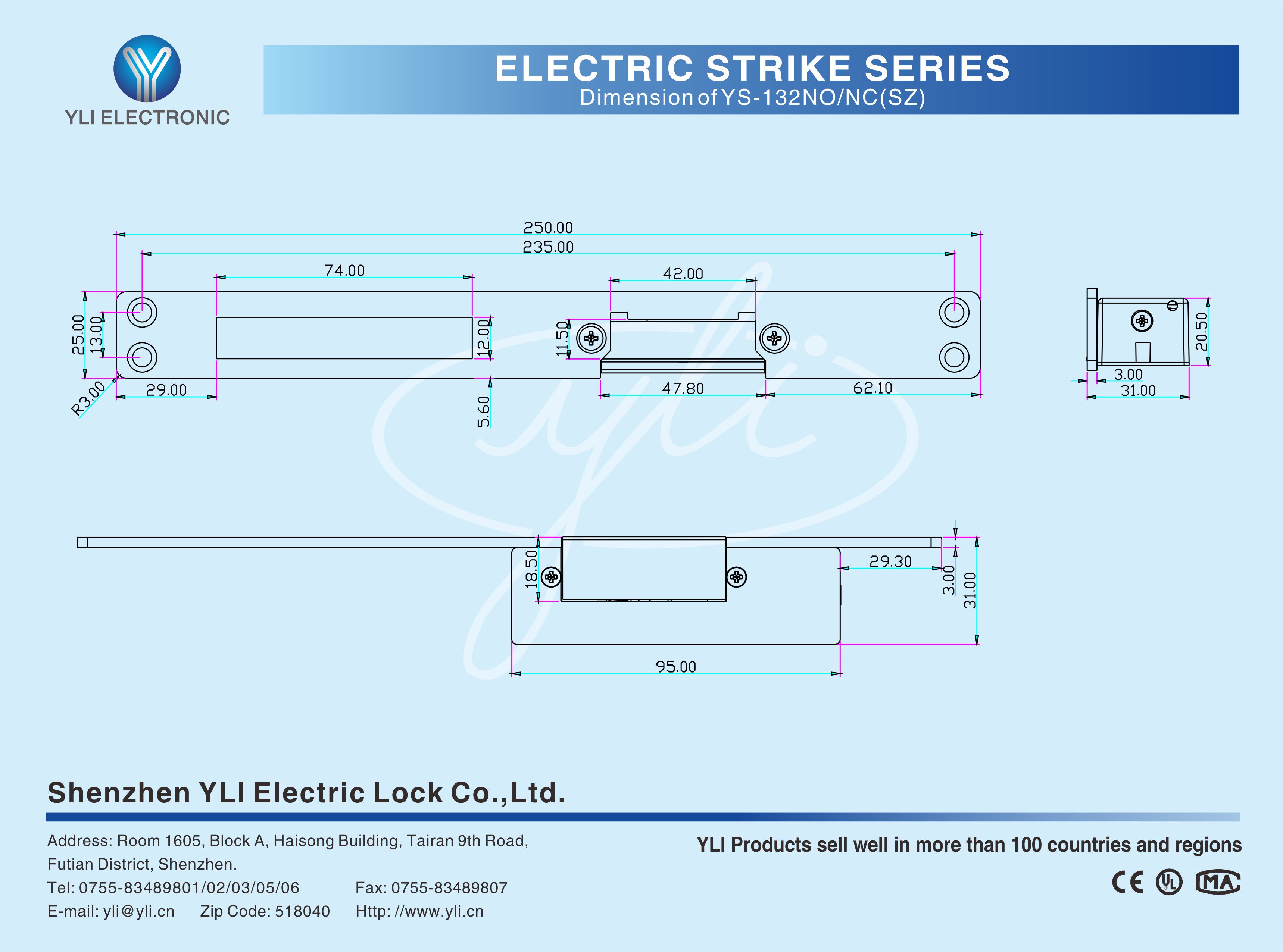 YS-132NO/NC(SZ) is electric strike with long face plate, which designed for the application of European type electric mechanical locks. It suitable for wooden door, metal door, PVC door and so on. It can achieve dual functions of "electric control" for daily use and "manual" opening in emergency. The electric strike adopts a continuously working type durable solenoid valve, which can be selected as (NO, Fail-Secure) or (NC, Fail-Safe). The lock tongue use 304 stainless steel, and the internal connecting parts are use iron-based materials with hardening treatment, which is durable.