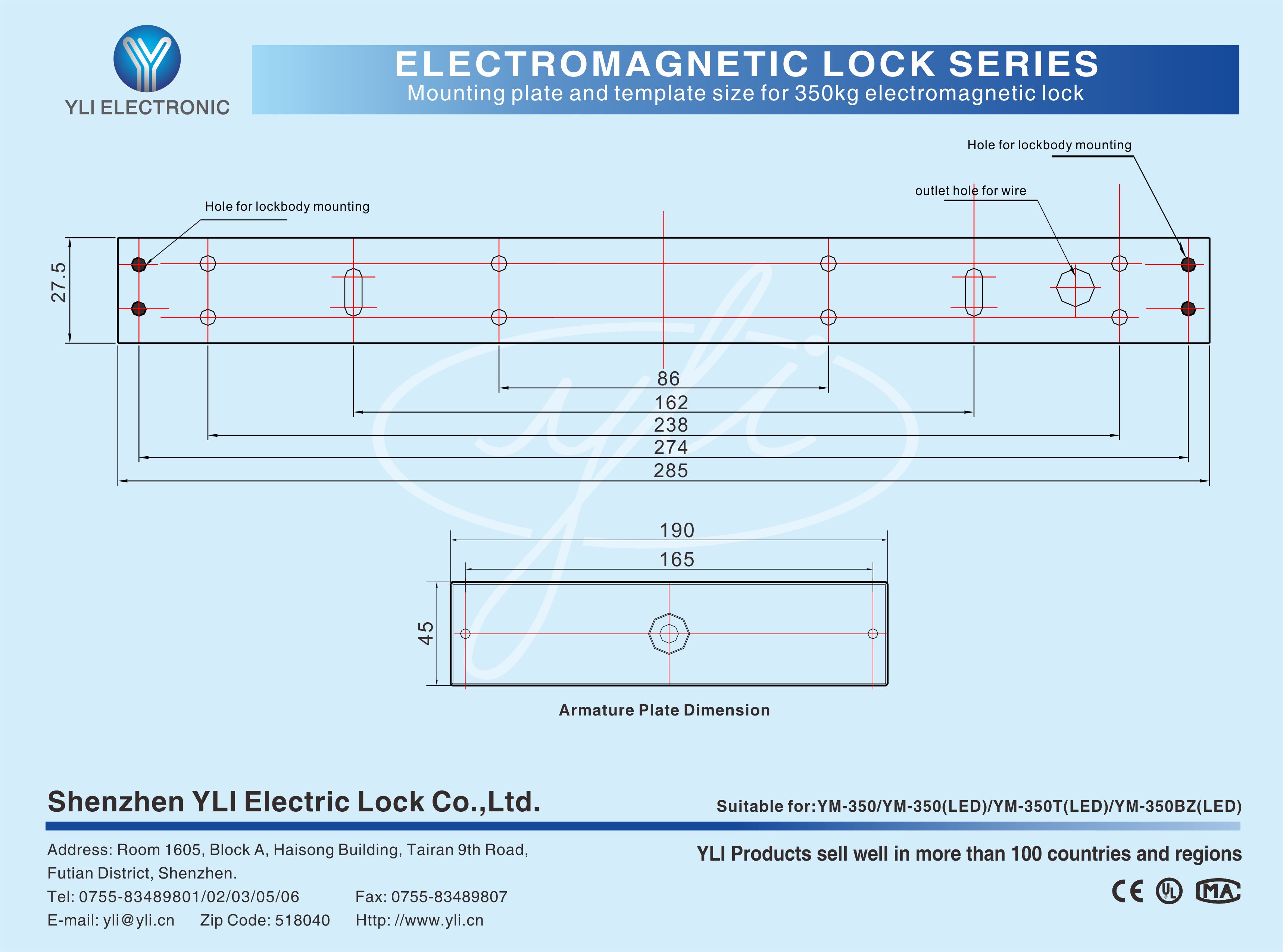 YM-350BZ(LED) Single door magnetic lock is designed for wooden door, metal door, glass door and fireproof door. it is equipped with a set of buzzer alarm. The internal buzzer alarm will sound until the door is closed if the lock is not closed within the set time (0-20 seconds). There is a set of lock status signal (NO/NC/COM) output contacts, which provides real-time feedback for the access control system.The lock body is equipped with a large LED light. The green light indicates unlocking, and the red light indicates locking. YLl magnetic lock cores are produced with robotic laser welding technology, providing 2 to 3 times stronger impact resistance and torsional resistance than conventional production processes. The surface is treated with the internationally leading electroplating process and the lock itself has passed the 240-hour salt spray test in the national laboratory, achieving excellent performance of anti-oxidation, anti-rust and anti-corrosion. Our company offers a complete range of brackets for different locks.