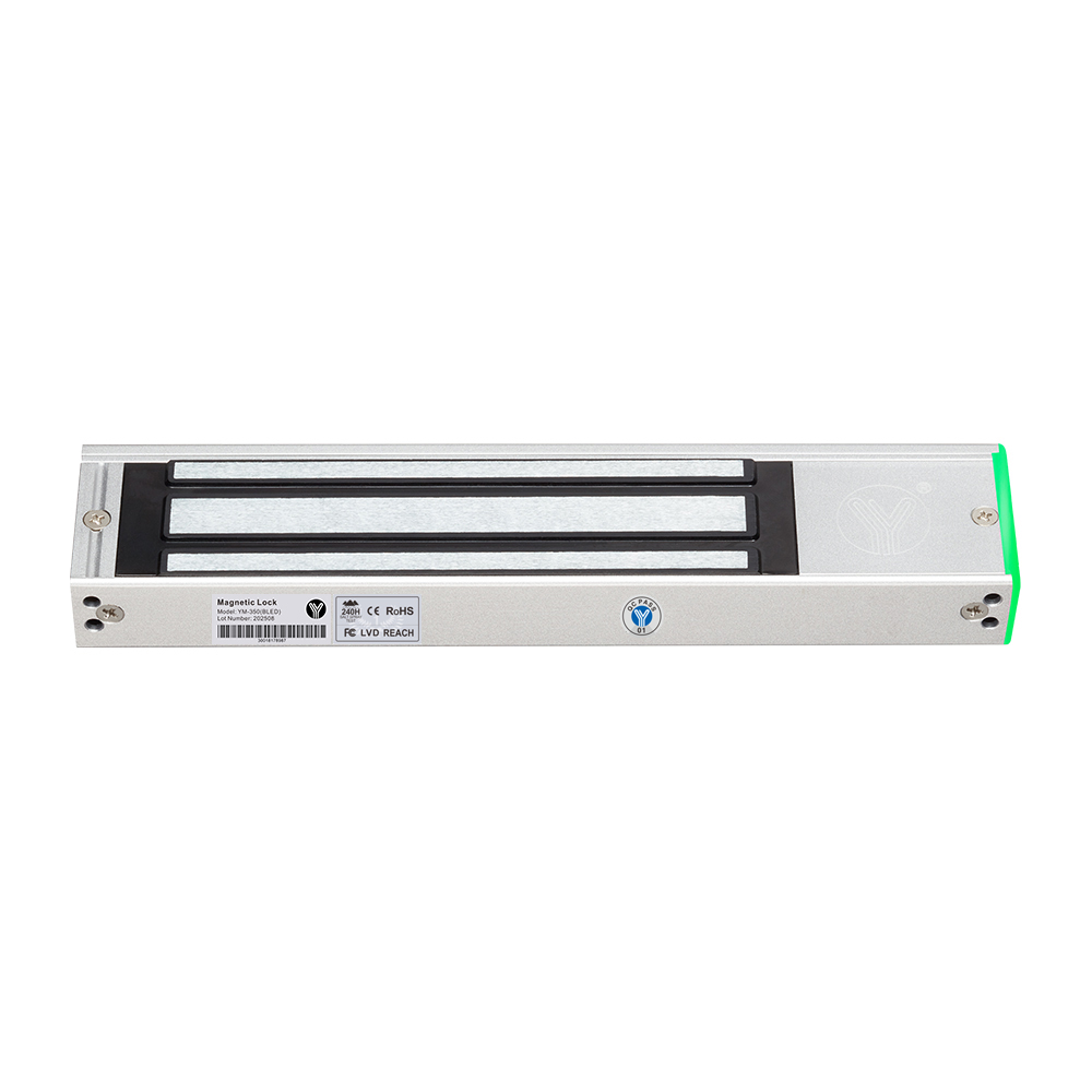 YM-350(BLED) Single door magnetic lock is designed for wooden door, metal door, glass door and fireproof door. There is a set of lock status signal (NO/NC/COM) output contacts. The lock body is equipped with a large LED light, The green light indicates unlocking, and the red light indicates locking. YLl magnetic lock cores are produced with robotic laser welding technology, providing 2 to 3 times stronger impact resistance and torsional resistance than conventional production processes. The surface is treated with the internationally leading electroplating process and the lock itself has passed the 240-hour salt spray test in the national laboratory, achieving excellent performance of anti-oxidation, anti-rust and anti-corrosion. Our company offers a complete range of brackets for different locks.