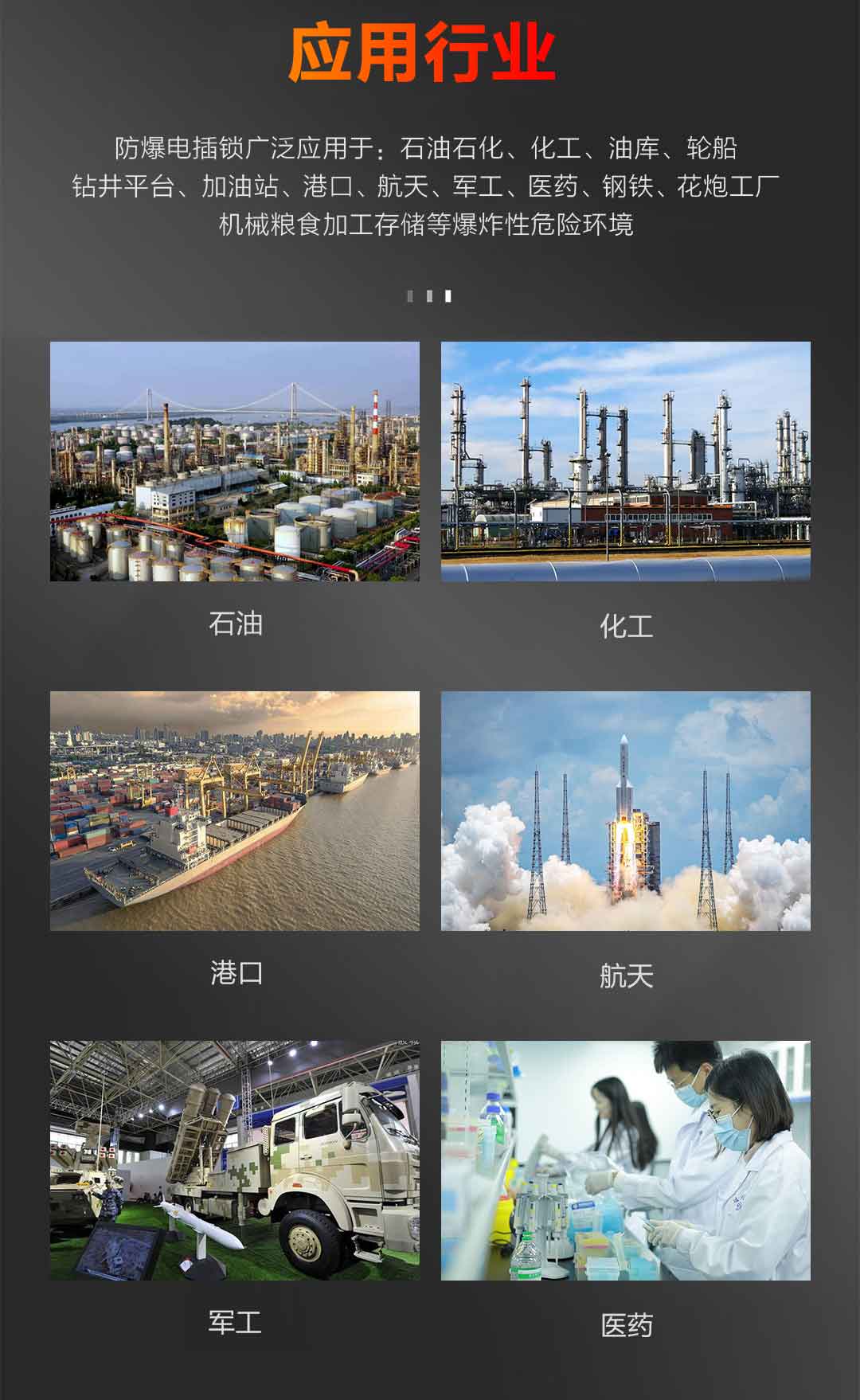 石油化工廠、煉油廠、油庫等易燃易爆場所。