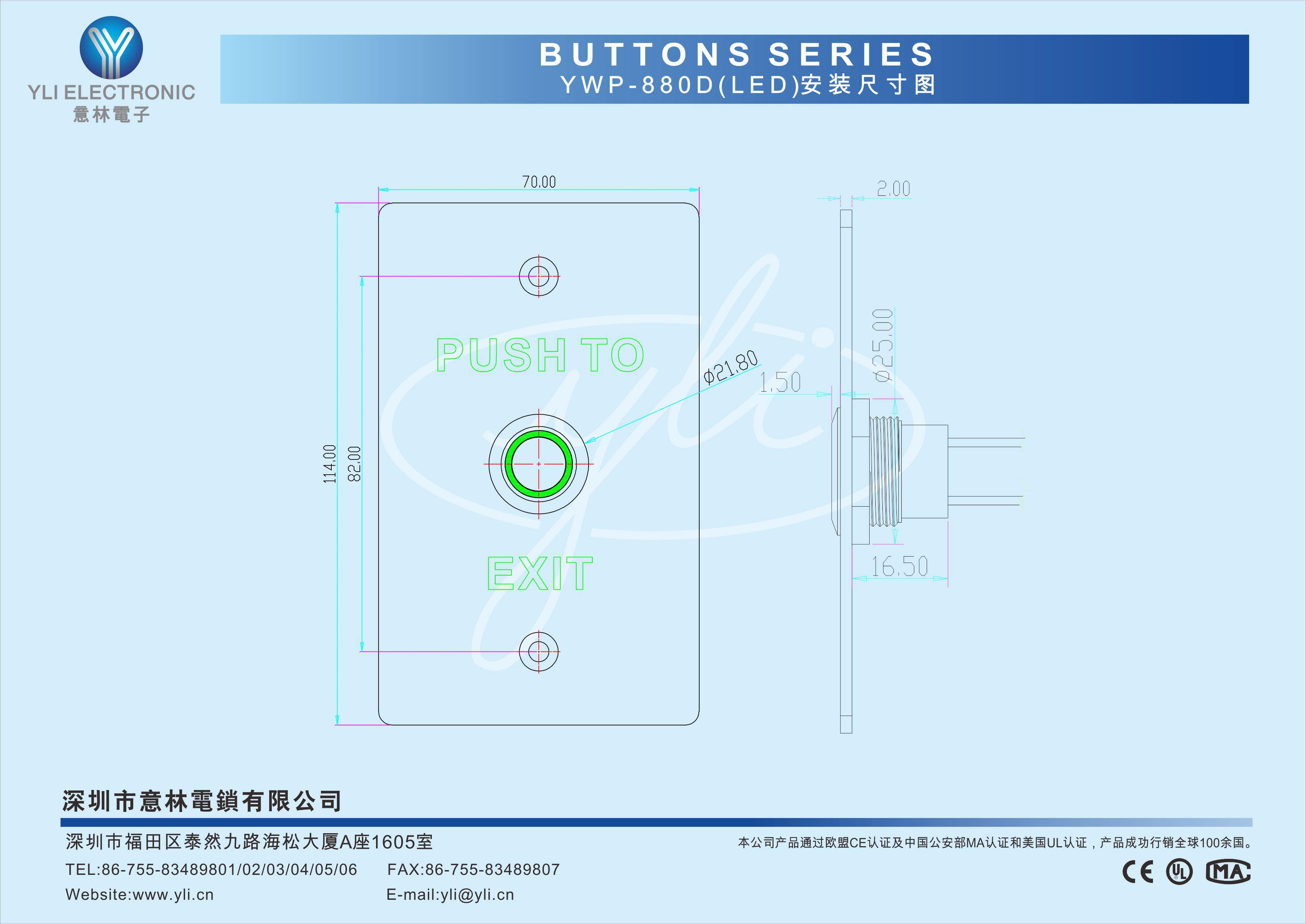 YWP-880D(LED)是一款防水型按壓式門禁專用開關(guān),防雨水設(shè)計(jì),LED燈顯示:通電亮燈,常亮綠色。面板304不銹鋼拉絲工藝處理,金屬材質(zhì)按鈕,經(jīng)CNC車床加工后拋光而成,100萬次耐用測(cè)試合格,堅(jiān)固耐用,產(chǎn)品美觀。門禁系統(tǒng)配套的最佳選擇。
