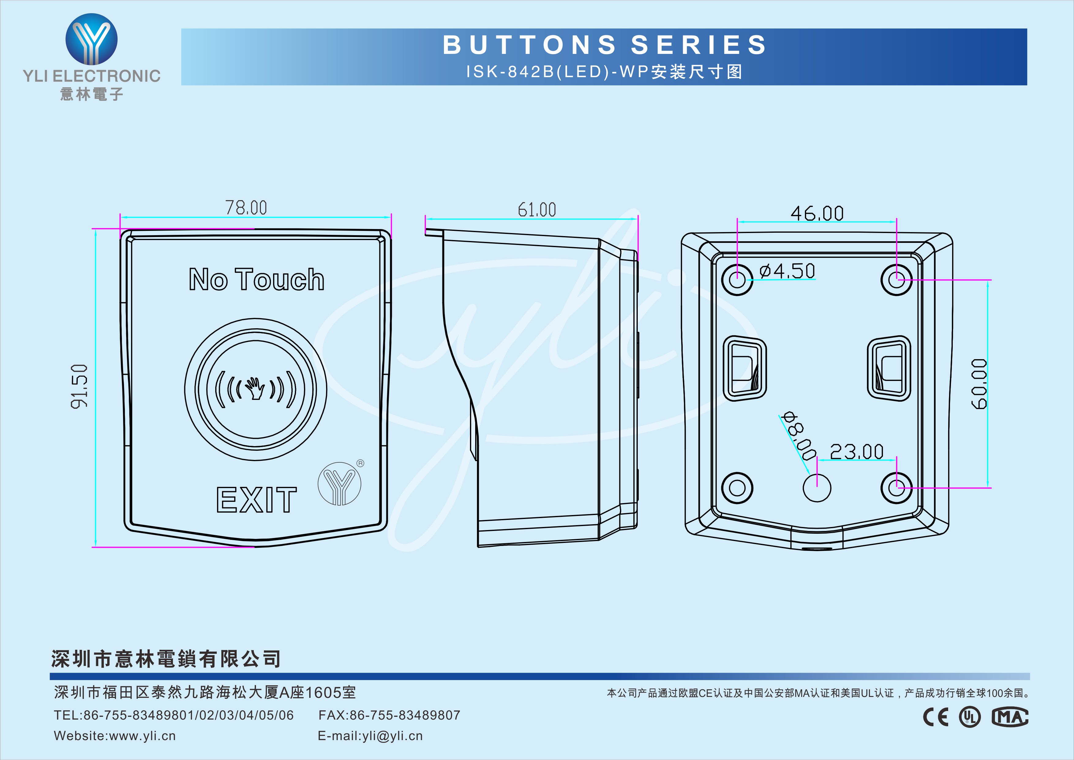 ISK-842B(LED)-WP 是一款明裝防水型紅外感應門禁開關, 采用全金屬結構,金屬按鈕。具有延時可調功能及感應功能,最大感應距離10cm。LED燈顯示: 紅色待機狀態; 綠色動作狀態。 防雨水、防拆設計,堅固耐用。適用于智能樓宇、住宅小區、辦公樓、酒店、醫院、體育館等場所使用。