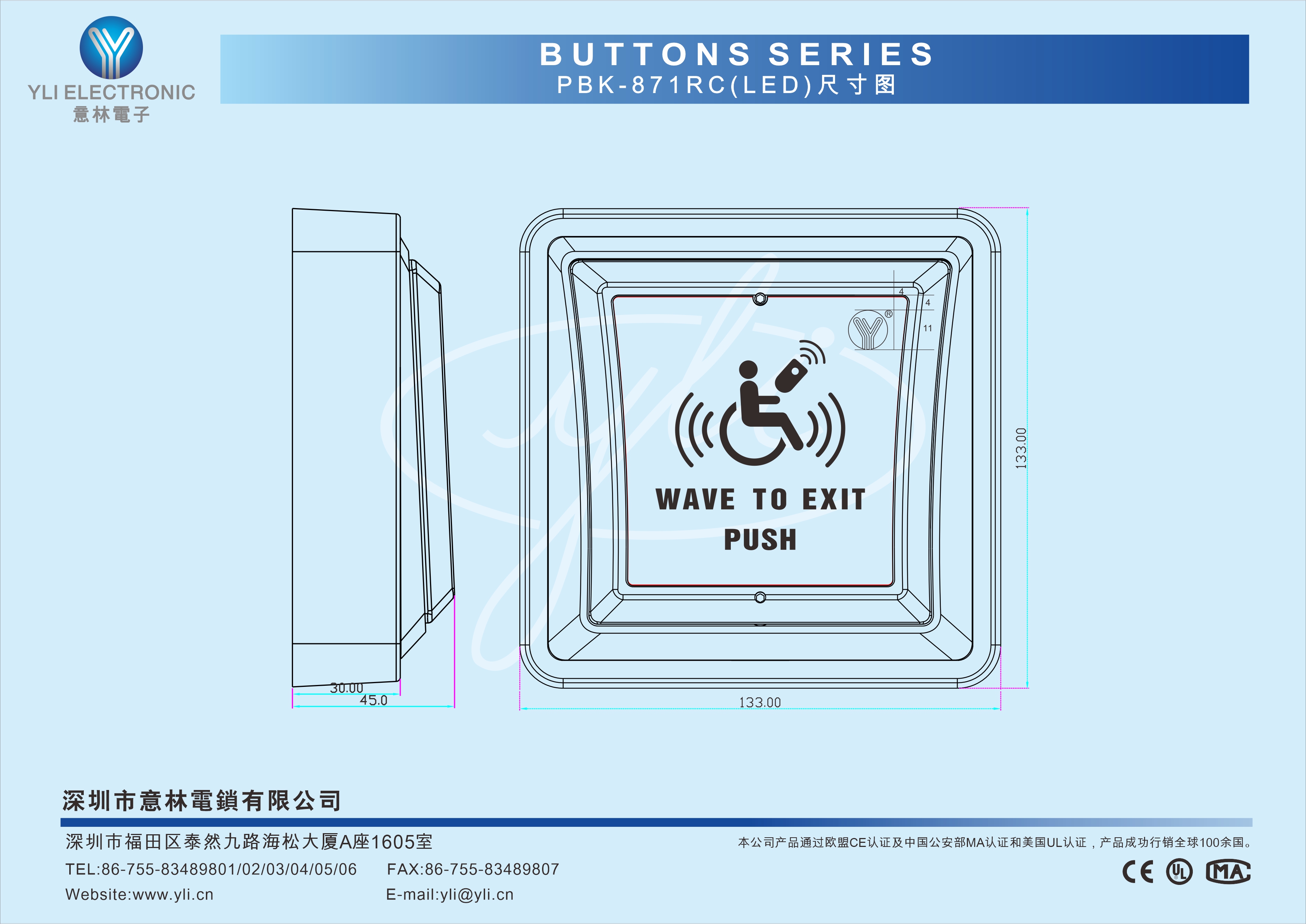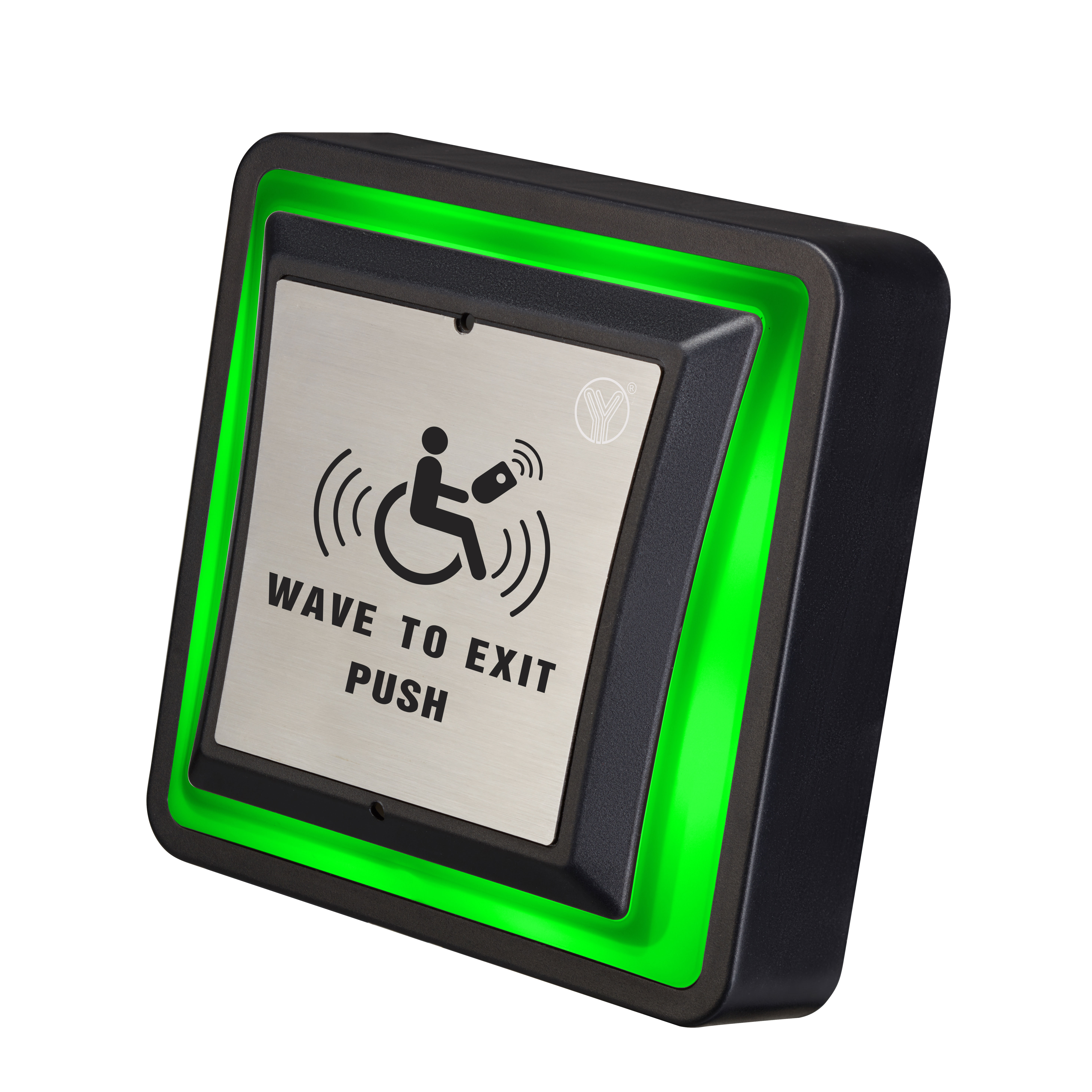 這是一款三功能(電容感應+機械按壓+遙控)三合一門禁出門按鈕。接入門禁控制系統之后,手掌感應或手指按壓面板都能有效開門。